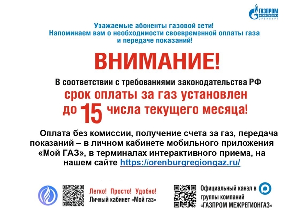 «Газпром межрегионгаз Оренбург» обращает внимание, что в квитанциях будут отражены новые сроки и оплатить потребленный газ за апрель нужно до 15 мая 2026 года. Сделать это без комиссии можно в мобильном приложении «Мой ГАЗ», в терминалах интерактивного приема, на нашем сайте https://orenburgregiongaz.ru/fizicheskim-licam/ceny-na-gaz-i-sposoby-oplaty